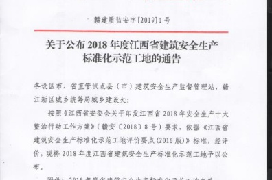 2018年全年安全創(chuàng)優(yōu)工作取得了顯著成績,江西省建筑工程安全質(zhì)量監(jiān)督管理局發(fā)布公告,我司承建的南水.中央公園(一期)項目被評為“2018年度江西省建筑安全生產(chǎn)標(biāo)準化示范工地