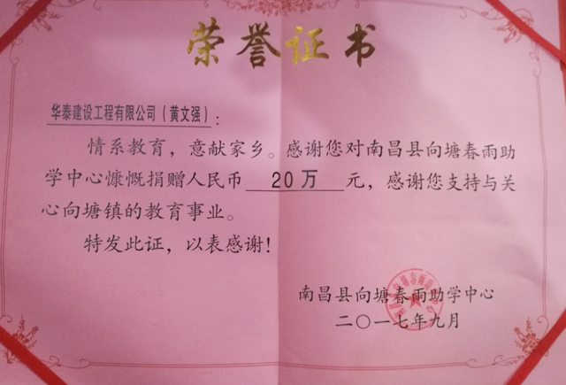 今天我們公司周總代表華泰建設(shè)及公司董事長黃總參加向塘春雨助學(xué)活動并捐獻愛心。公司在董事長倡議及帶領(lǐng)下,大力弘揚樂善好施的文明行為,積極營造人人關(guān)心、人人參與愛心助學(xué)行為的良好氛圍,先后參與春雨助學(xué)、苗苗助學(xué)等愛心活動。