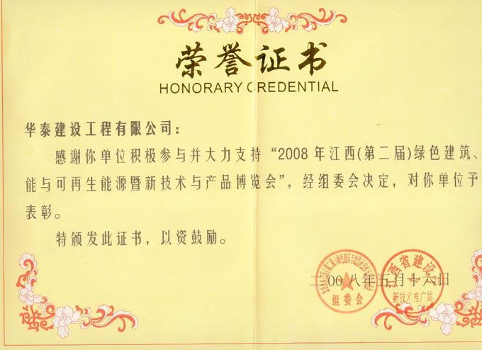 榮獲2008年綠色建筑博覽會榮譽證書