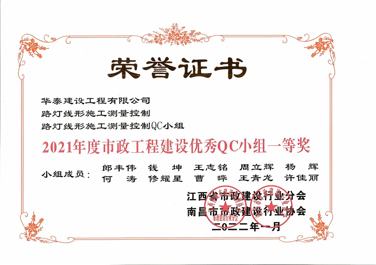 榮獲2021年度江西省市政工程建設(shè)優(yōu)秀QC小組一等獎 (路燈線形施工測量控制)