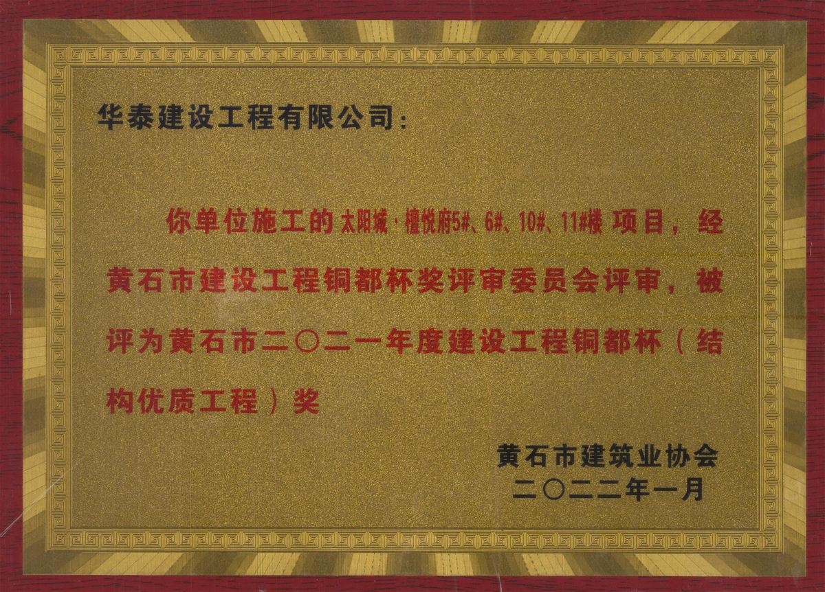 榮獲黃石市2021年度建設工程銅都杯(結構優(yōu)質工程)獎